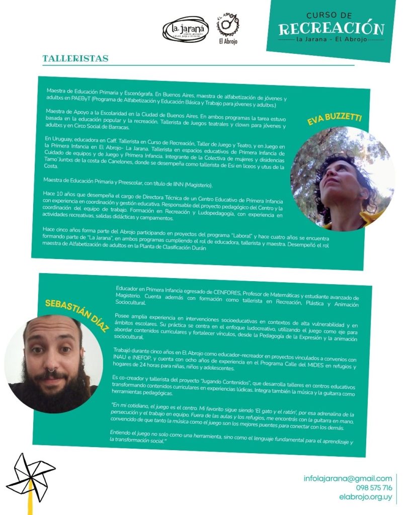El instituto de educación Popular “El Abrojo” a través de su programa La Jarana pretende desarrollar un programa de capacitación dirigido a educadores, maestros y profesionales del área social que desempeñas tareas en el ámbito del ocio, la recreación, la educación formal y no formal, así como la intervención social y comunitaria.