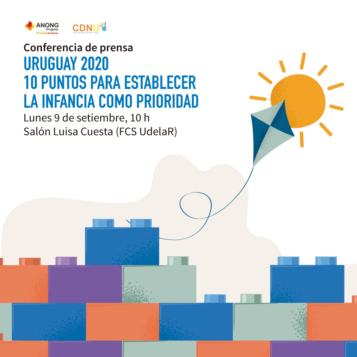 El lunes 9 de setiembre a las 10 horas en el Salon Luisa Cuesta de la Facultad de Ciencias Sociales-UdelaR la ANONG y el CDNU realizaremos una conferencia de prensa para lanzar un documento con propuestas para establecer las infancias y adolescencias como prioridad.