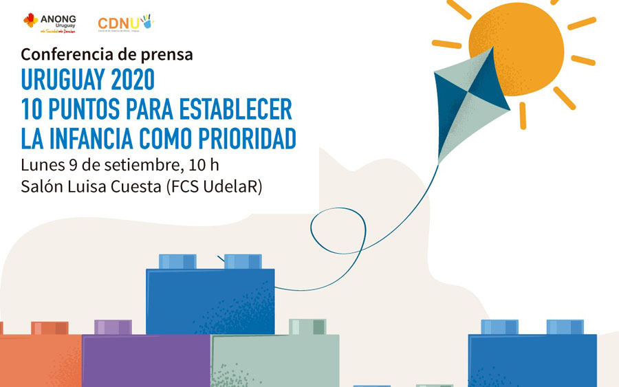 El próximo lunes 9 de setiembre a las 10 horas en el Salón Luisa Cuesta de la Facultad de Ciencias Sociales de la Universidad de la República (Constituyente 1502), la Asociación Nacional de ONG Orientadas al Desarrollo (ANONG) y el Comité de los Derechos del Niño/a del Uruguay presentarán un documento de posicionamiento político con 10 propuestas para las infancias y adolescencias como prioridad; que será expuesto y dialogado con los 11 partidos que participan en las elecciones nacionales para el período de gobierno 2020-2025.